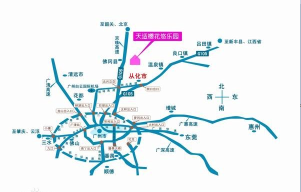 華南快速路→京珠高速G4→往從化方向的街北高速G45→往從化市區(qū)方向的街口收費(fèi)站→從化市區(qū)方向→按道路指示牌(萬(wàn)花園方向)行駛→按道路指示牌(天適櫻花悠樂(lè)園方向)行駛至天適櫻花悠樂(lè)園。