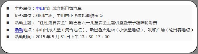 5月31日將舉行一場“兒童安全”方面別開生面的趣味系列活動,將由中山匯成洋斯巴魯火炬店主辦的“六一”兒童主題活動,“關(guān)注兒童安全”課堂 講座暨親子輪滑賽正式開始火熱招募!本次活動有兩大亮點(diǎn):